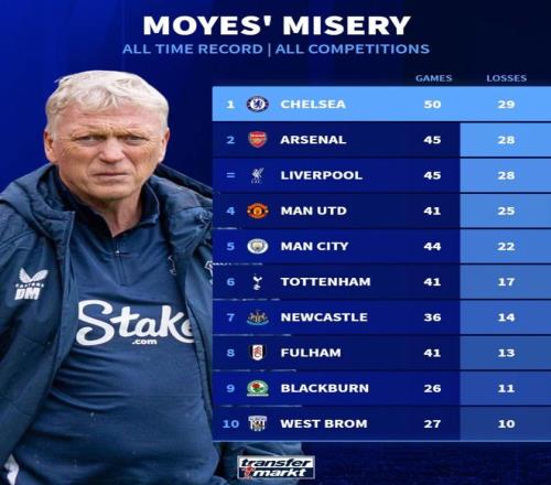 赛后来自德转的统计指出,这是莫耶斯教练生涯至今带队各项赛事50次对阵切尔西吃到的第29场败仗,蓝军也超越阿森纳和利物浦(28负)成为了这位苏格兰教头教练生涯至今输球场次最多的对手。