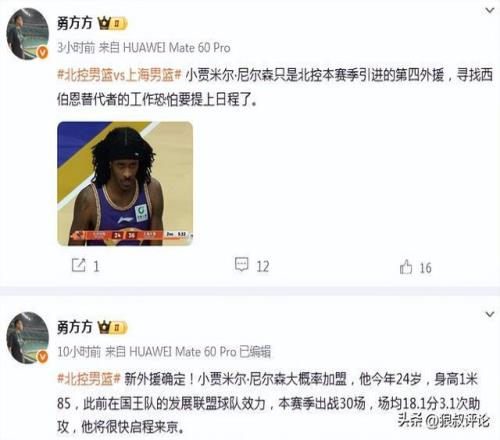 有消息称,北控男篮引进了小贾米尔·尼尔森,今年24岁,身高1米85,此前在国王队的发展联盟球队效力,本赛季出战30场,场均18.1分3.1次助攻,他将很快启程来京。