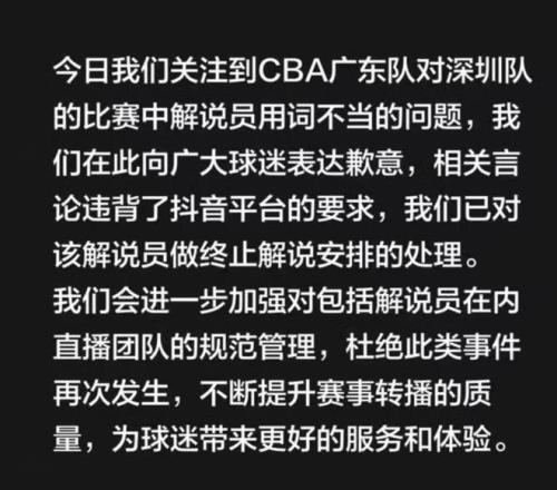 面对批评,抖音体育反应很快,不但公开作出了道歉,还对担任本场的解说员作了处理,终止了他的解说资格。抖音体育表示,我们关注到CBA广东队对深圳队的比赛中解说员用词不当的问题,我们在此向广大球迷表达歉意,相关言论违背了抖音平台的要求,我们已对该解说员做终止解说安排的处理。我们会进一步加强对包括解说员在内直播团队的规范管理,杜绝此类事件再次发生,不断提升赛事转播的质量,为球迷带来更好的服务和体验。